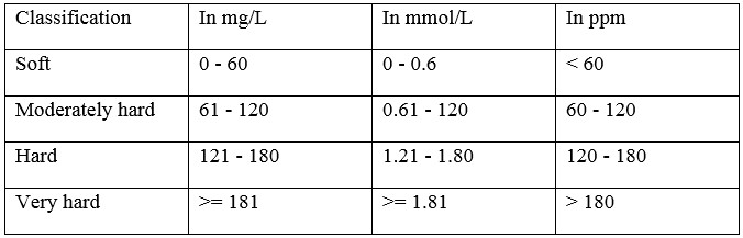 According to varying amount of Ca2+ and Mg2+ ions dissolved in water, water hardness could be separated into four categories, which include are soft, moderately hard, hard, and very hard. To determine the hardness of water, there are several units to use, such as Molarity (M), Parts Per Million (ppm) of hardness (CaCO3), and the ppm of ions (Ca2+ and Mg2+). From Table 1, readers can understand the range of different categories of waters. (3)